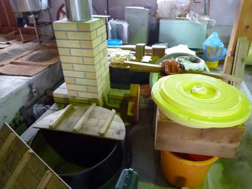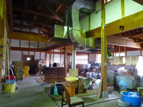 入ったところで、すぐに目に付くのが大きな釜、これで大豆をゆがくそうです。さらに奥には、大豆と米糀を混ぜる場所、ミンチにする機会などがありました。