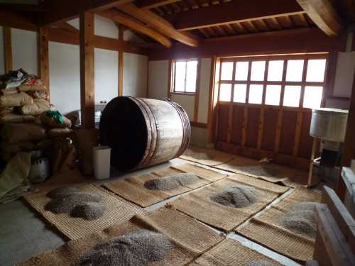 部屋は良質の糀をつくるために温度が一定になるように工夫された部屋で、部屋と部屋の間には30センチの壁があるそうです。さらにその30センチの壁の中には、焼いた籾が入っているそうです。